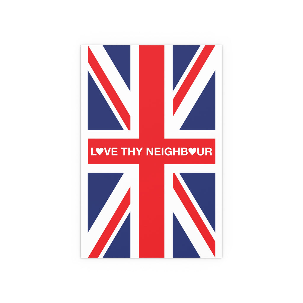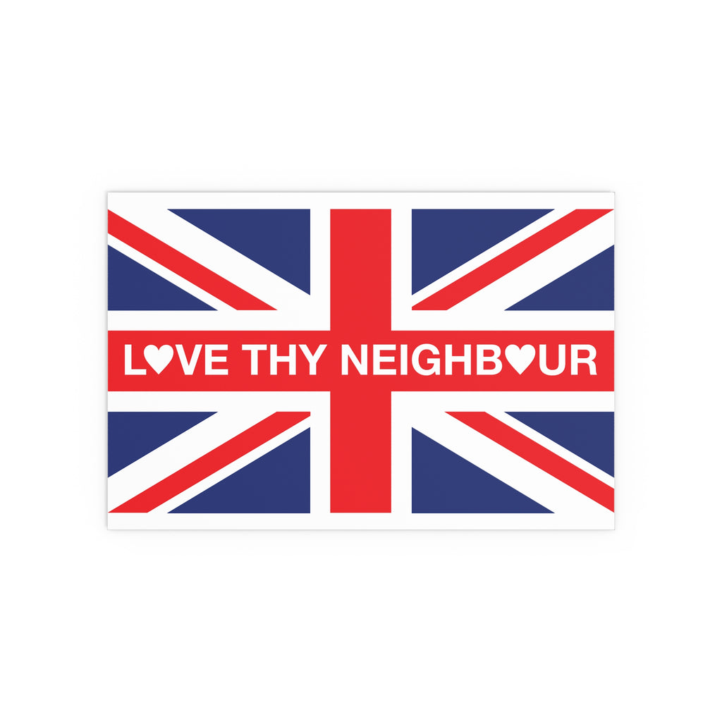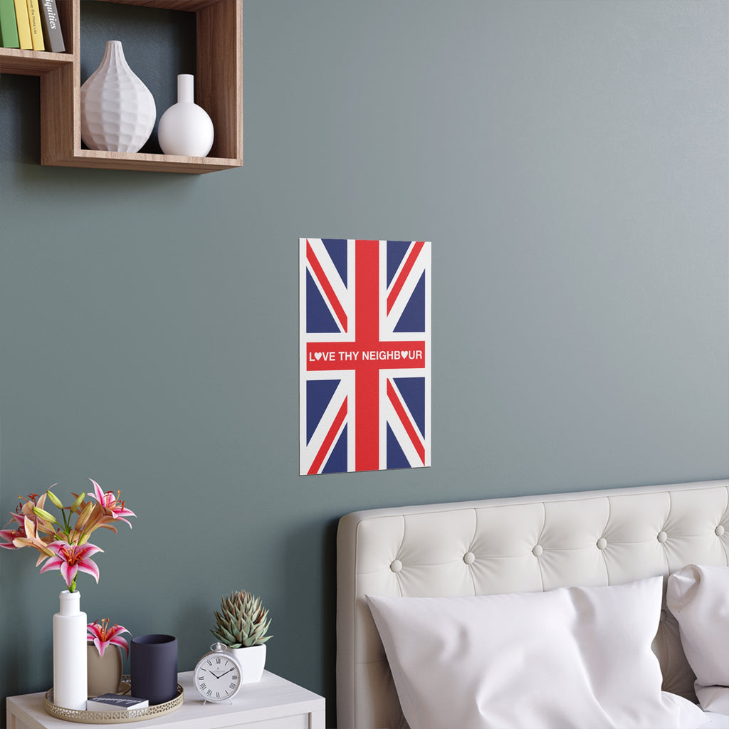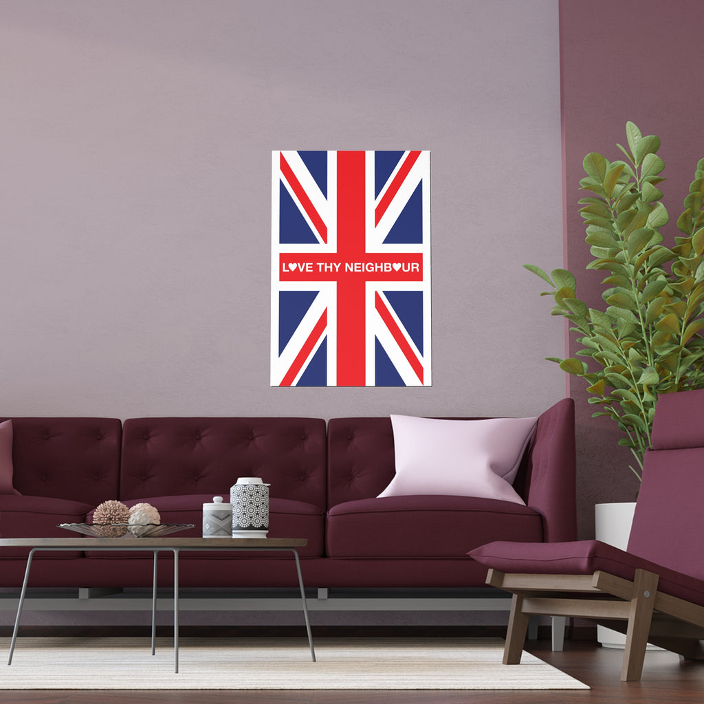 Make space for pride that welcomes everyone. Our Love Thy Neighbour Union Jack poster reimagines the Union Flag as a bold, modern statement for homes, studios, and storefronts. Clean lines, saturated colour, and a semi-gloss finish give the design real presence—whether you hang it framed on a wall or display it in a window.