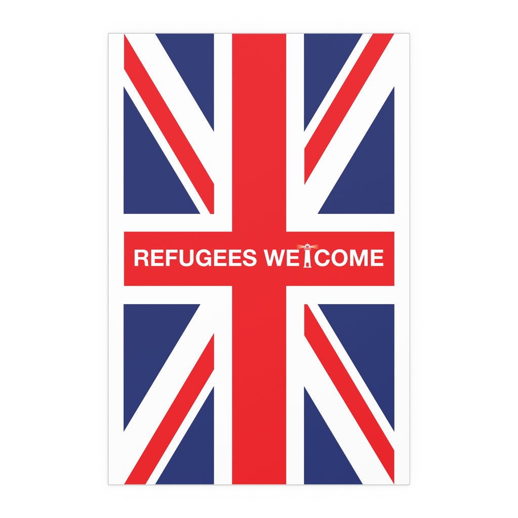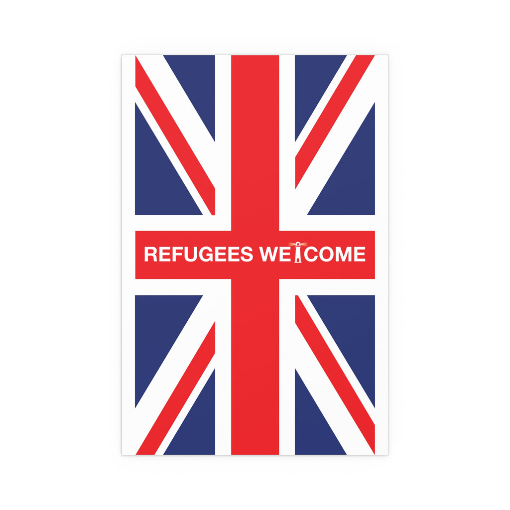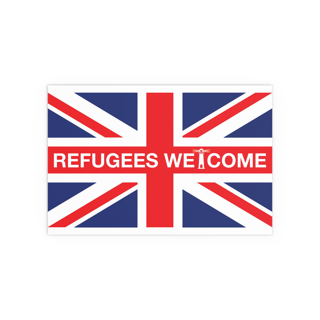 Make space for pride that welcomes everyone. Our Refugees Welcome Union Jack poster reimagines the Union Flag as a bold, modern statement for homes, studios, and storefronts. Clean lines, saturated colour, and a semi-gloss finish give the design real presence—whether you hang it framed on a wall or display it in a window.